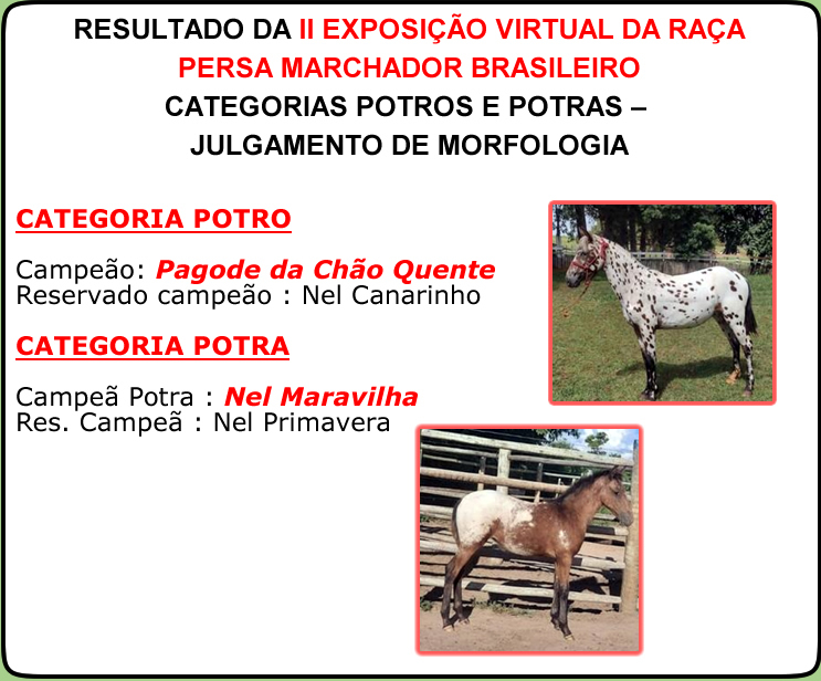 * Resultado - II EXP. VIRTUAL DA RAÇA PERSA MARCHADOR BRASILEIRO - CAT. POTROS E POTRAS – JULG. DE MORFOLOGIA